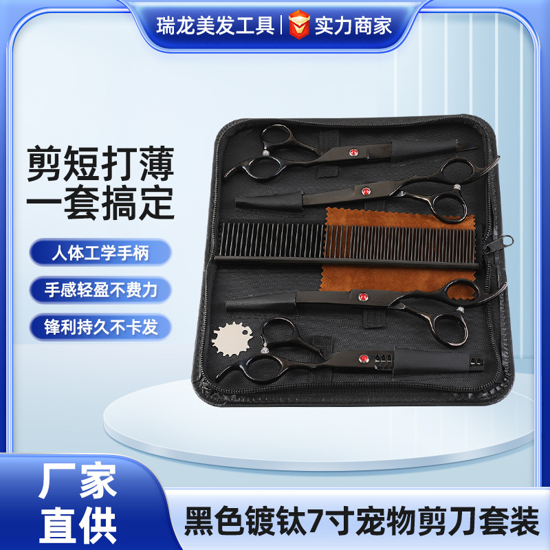 黑色镀钛7寸宠物剪刀套装家用剪刀修毛剪剃毛剪直剪宠物美容工具