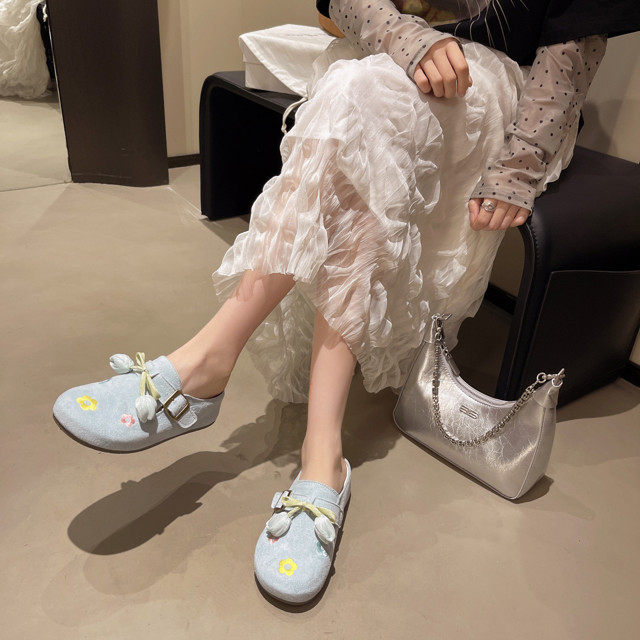 复古花朵配裙子超火包头半拖女鞋外穿2025新款夏一脚蹬勃肯鞋子女