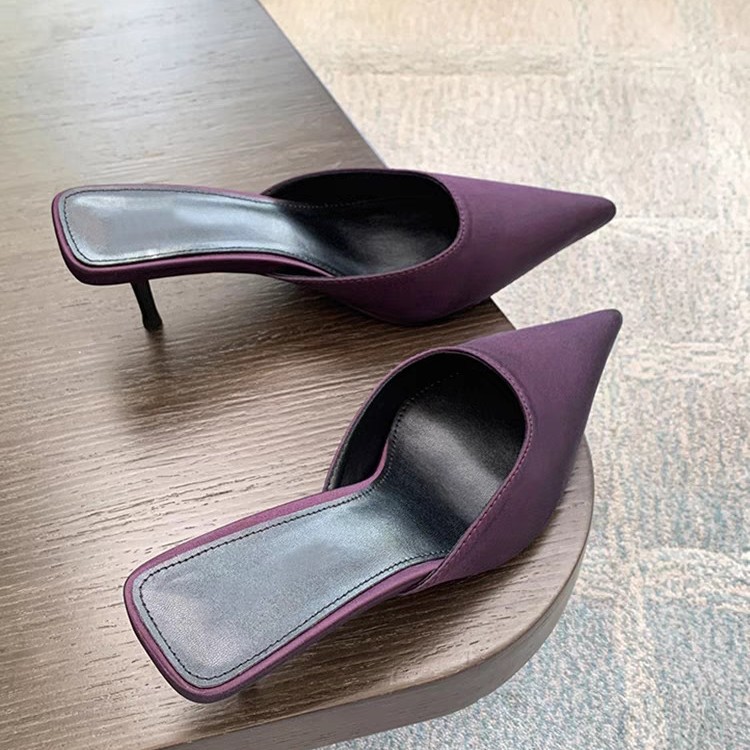 尖头浅口包头半拖气质2025年细跟黑色绸缎法式高跟鞋凉鞋外贸大码