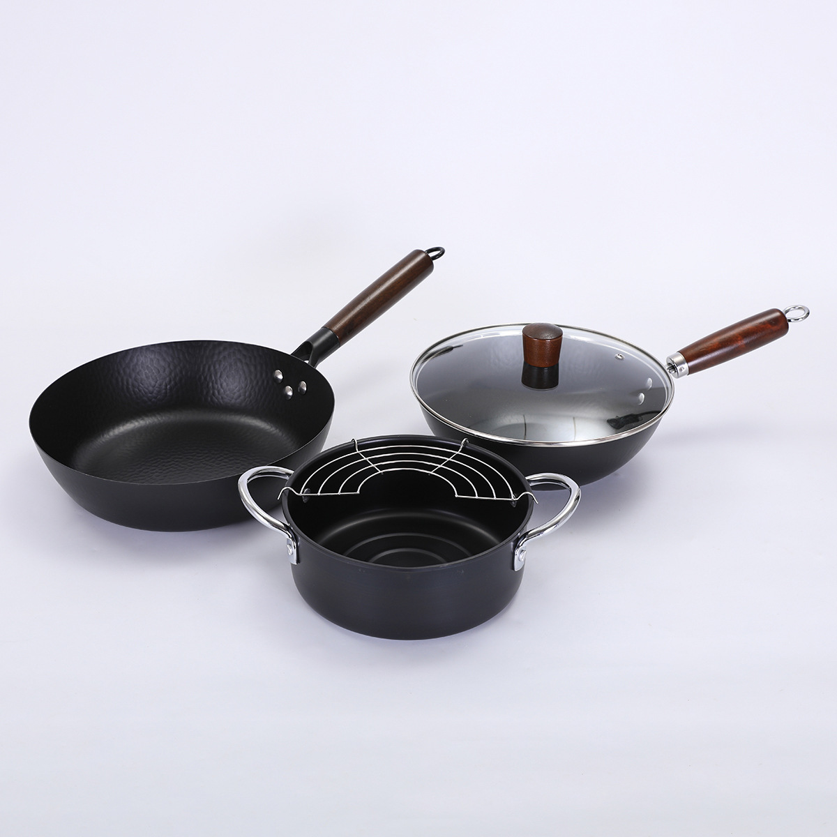 新款烹饪多功能锅日式天妇罗油炸锅带沥油架小炸锅章丘铁锅三件套