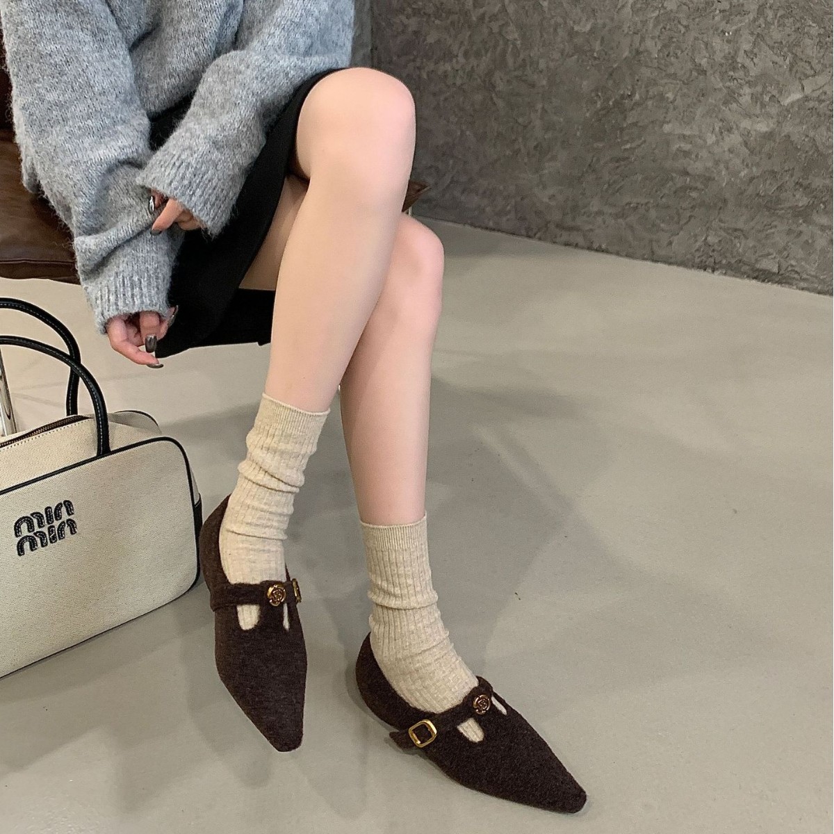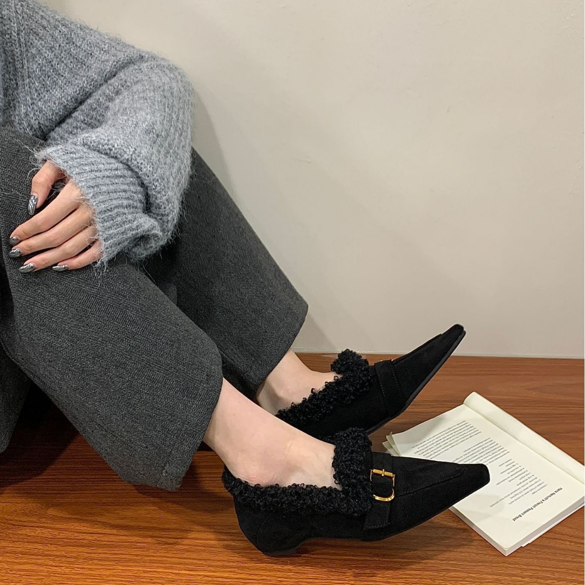2025新款晚风小方头加绒坡跟毛毛鞋单鞋羊羔毛深口成熟时尚毛鞋女