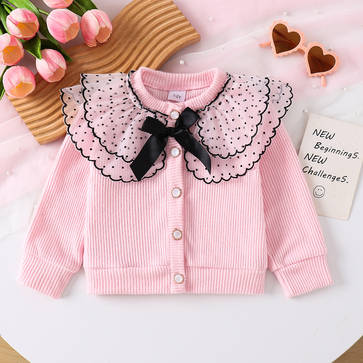 跨境女童时髦开衫 波点网纱大翻领 + 蝴蝶结装饰 小女孩洋气上衣