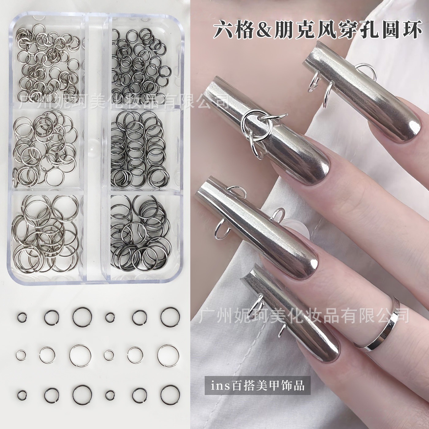跨境爆款6格穿孔圆环美甲饰品欧美风圆形圈圈金属diy穿戴指甲饰品