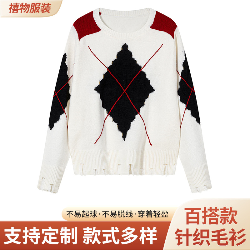 复古毛衣秋冬立体图案宽松慵懒毛衣菱格拼色针织打底衫女内搭毛衣