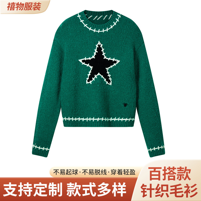 秋冬新款时尚宽松撞色星星毛衣胖mm宽松显瘦套头针织衫女