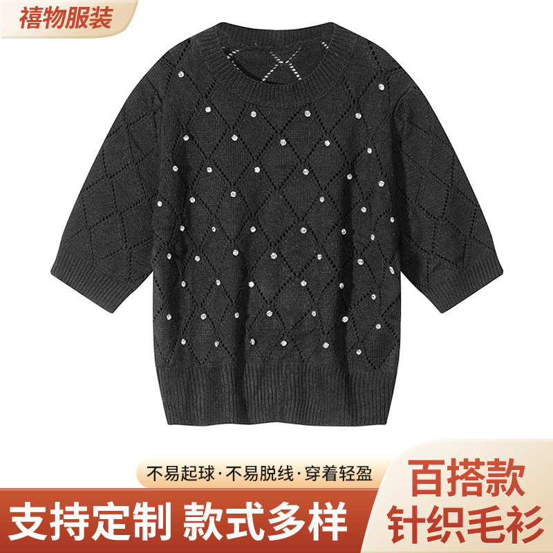高级感正肩泡泡袖镂空短款上衣薄小香风黑色短袖针织衫t恤女