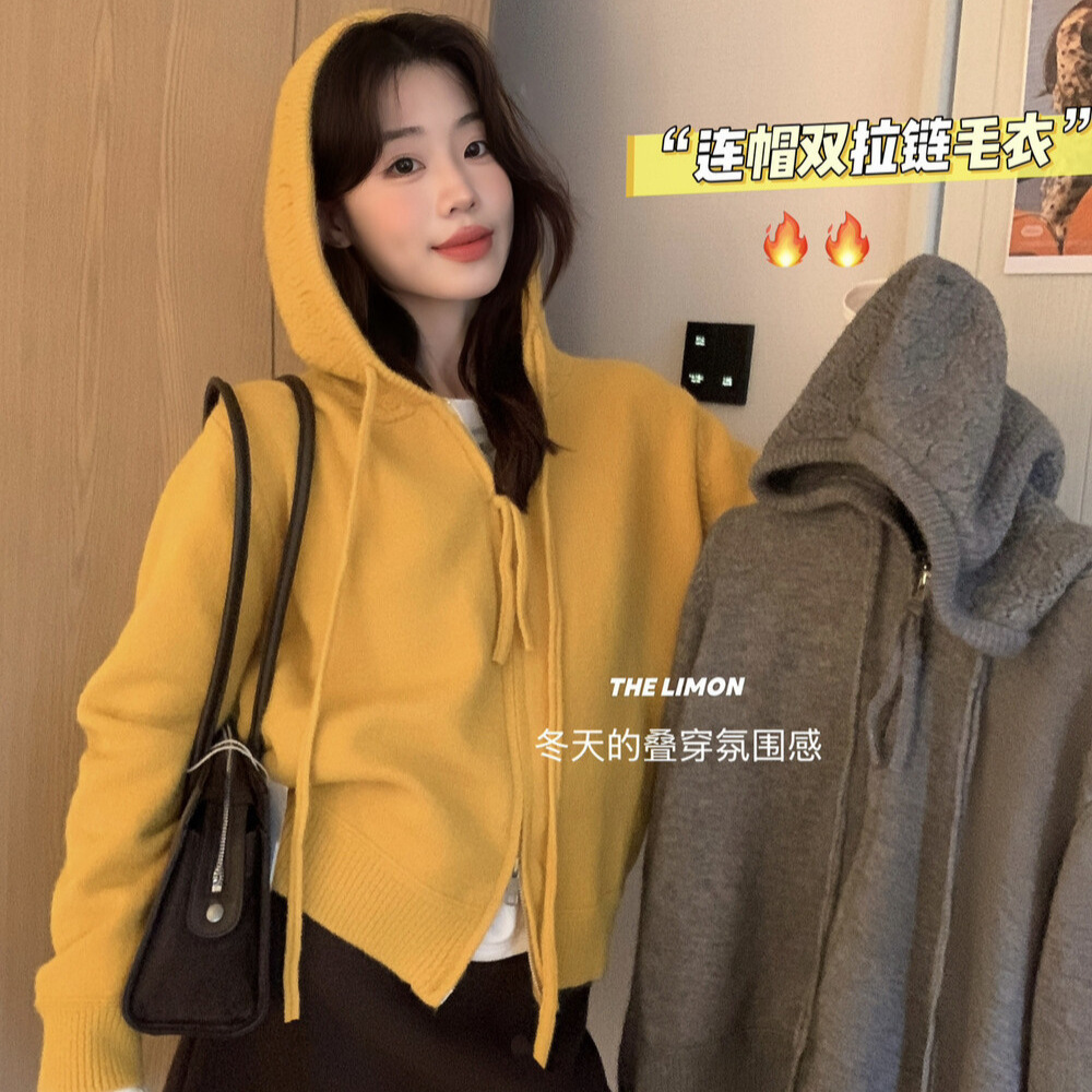 格雷系少女秋冬简约软糯舒适双拉链连帽宽松休闲连帽开衫保暖毛衣