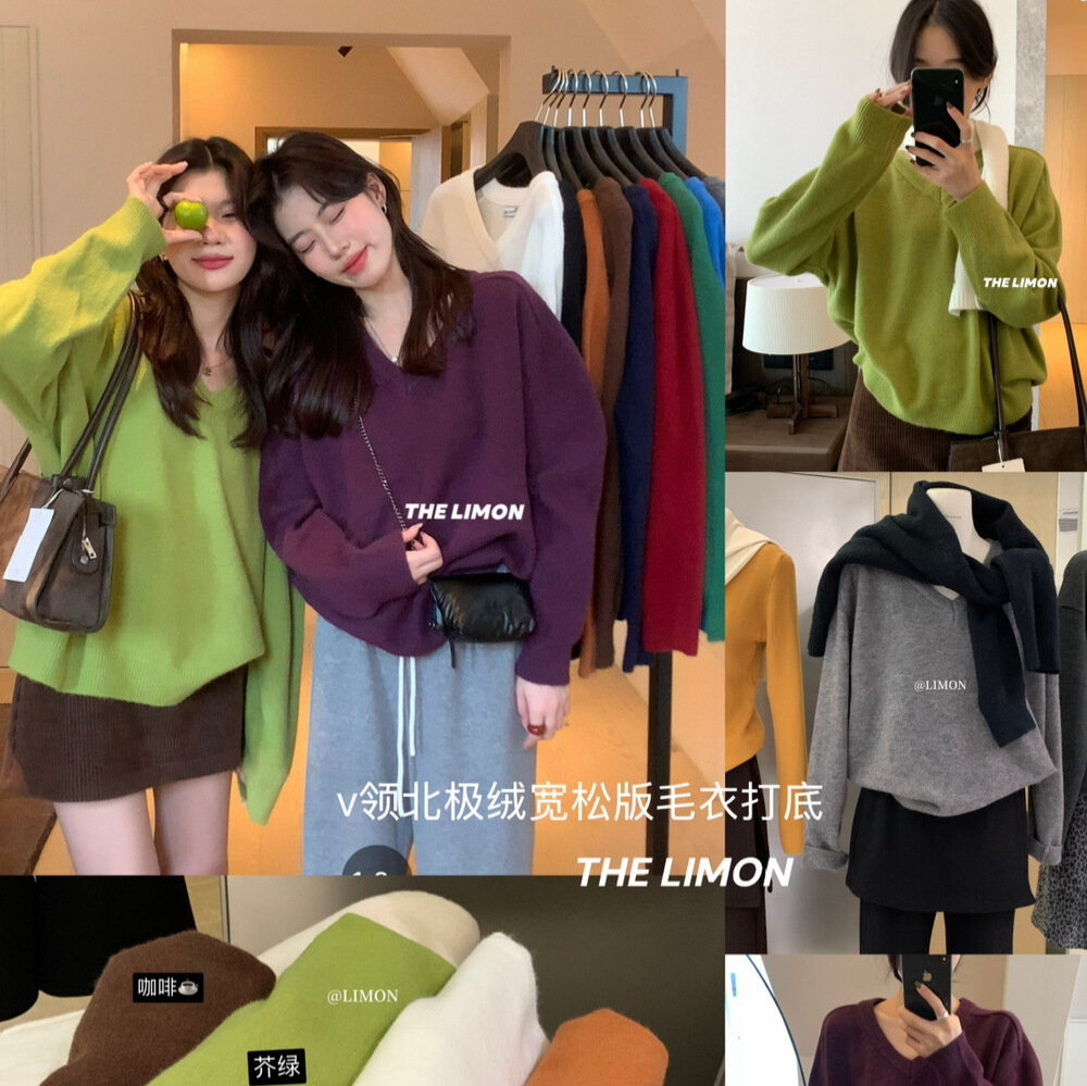 微胖宽松遮肉显瘦V领女秋冬宽松北极绒内搭打底保暖减龄长袖毛衣