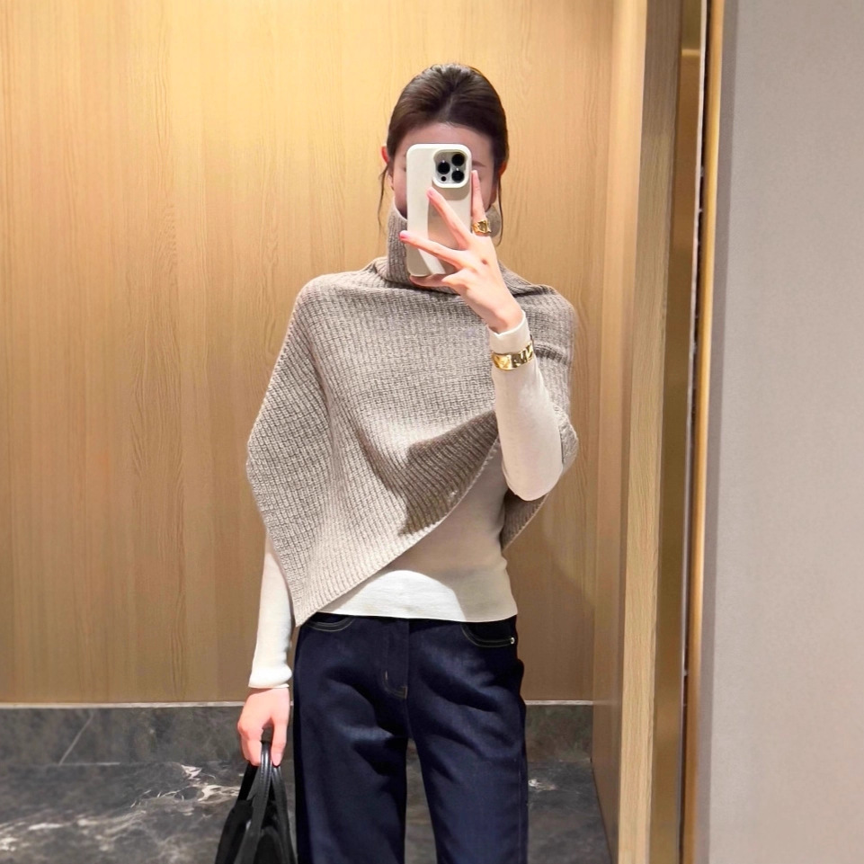 法式高级感杏色高领披肩针织衫女秋冬季不规则毛衣外搭斗篷小上衣