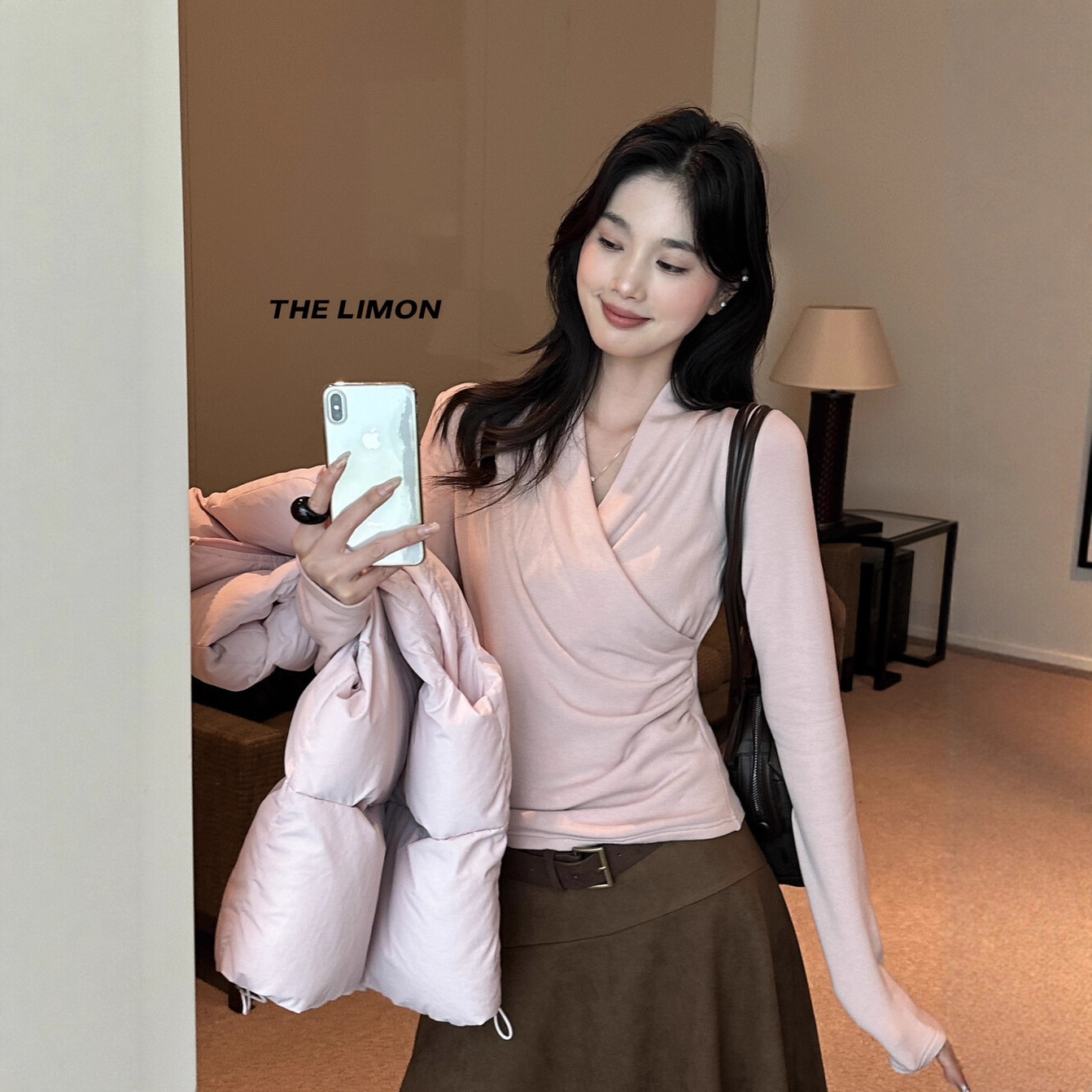 The Limon 2025十三行秋冬时髦法式气质交叉V领磨毛羊绒打底衫女