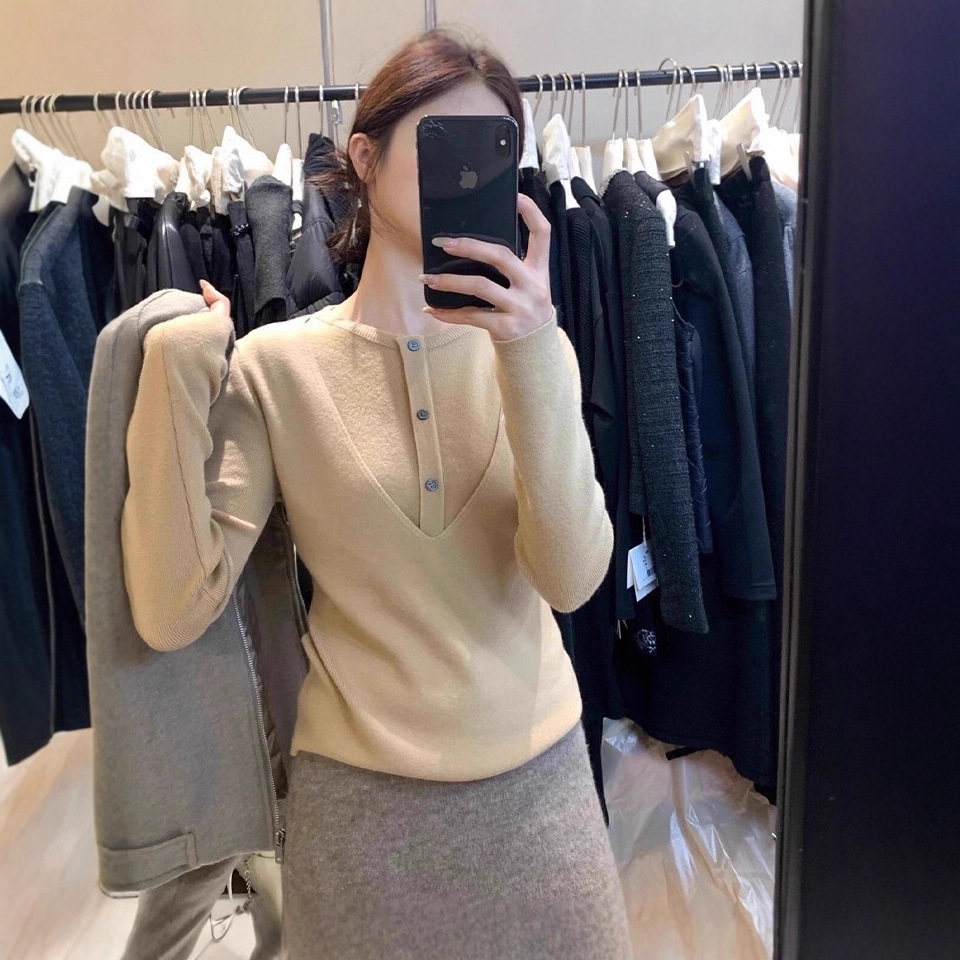 设计感奶茶色假两件长袖针织打底衫女秋冬季毛衣内搭修身短款上衣