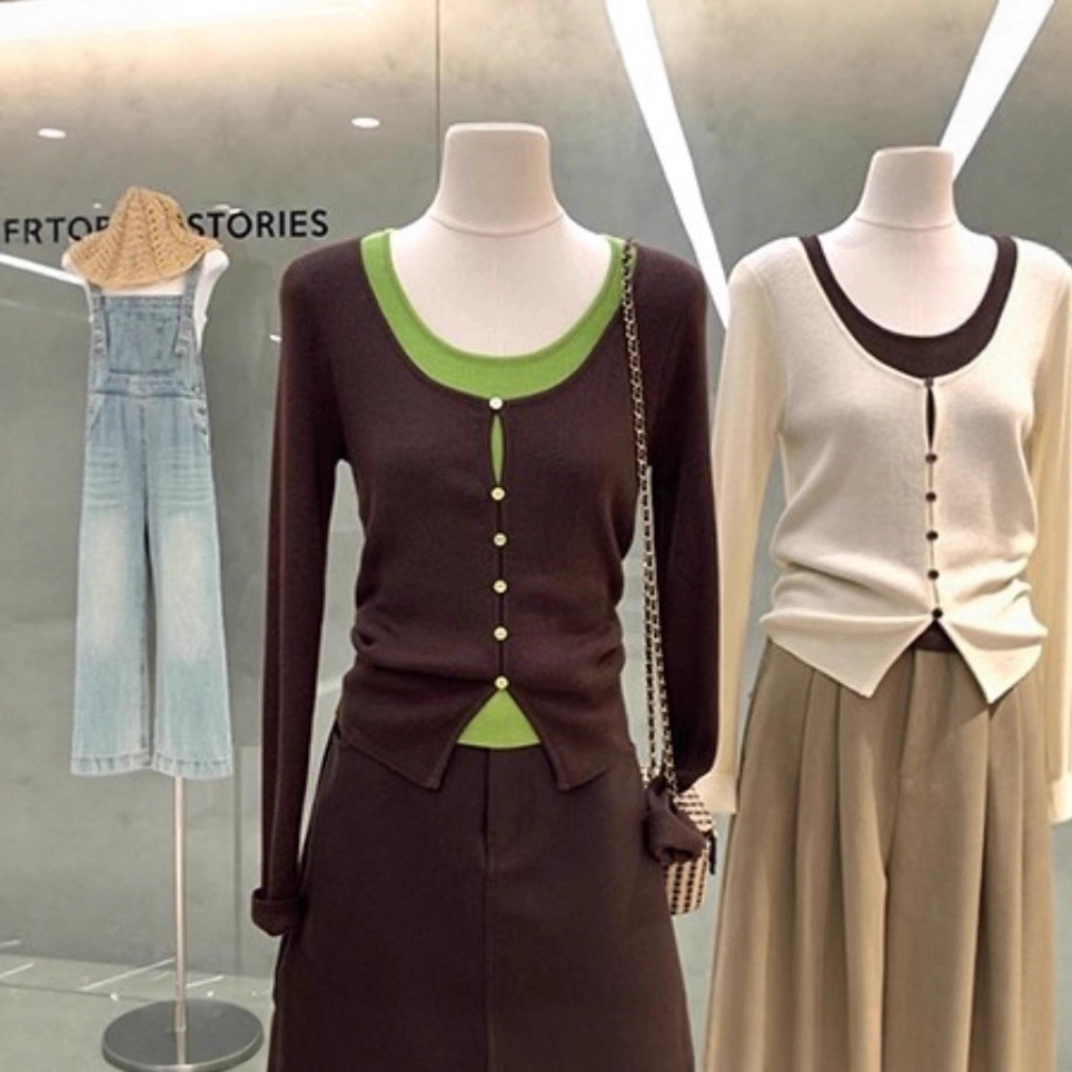 韩系欧尼温柔感假两件撞色针织衫2025款修身显瘦独特漂亮早秋上衣