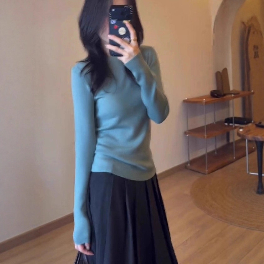 温柔系凡尔赛蓝色圆领长袖针织衫女早秋季小个子修身内搭打底上衣
