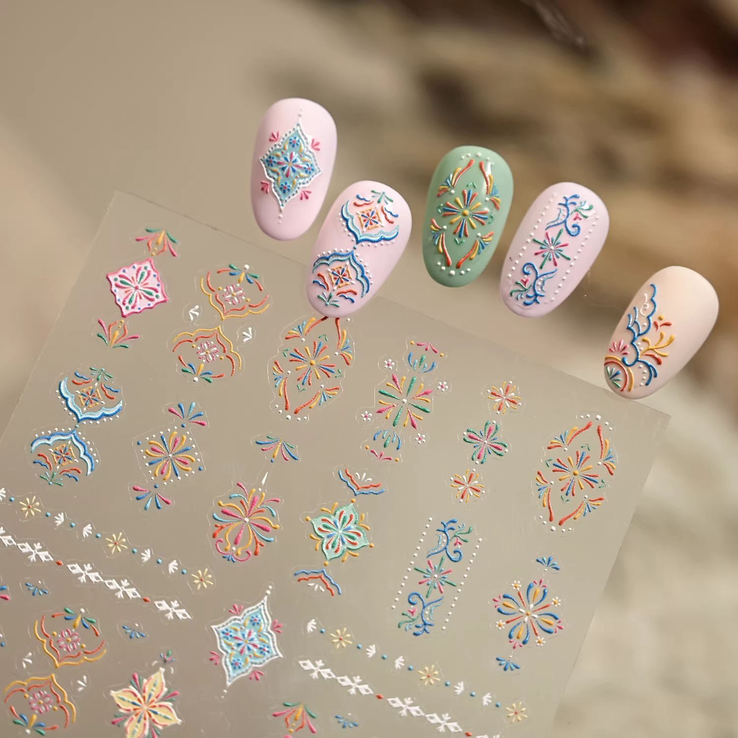 复古新款西米亚民族美甲贴纸浮雕花纹彩绘印花图案背胶指甲3d立体
