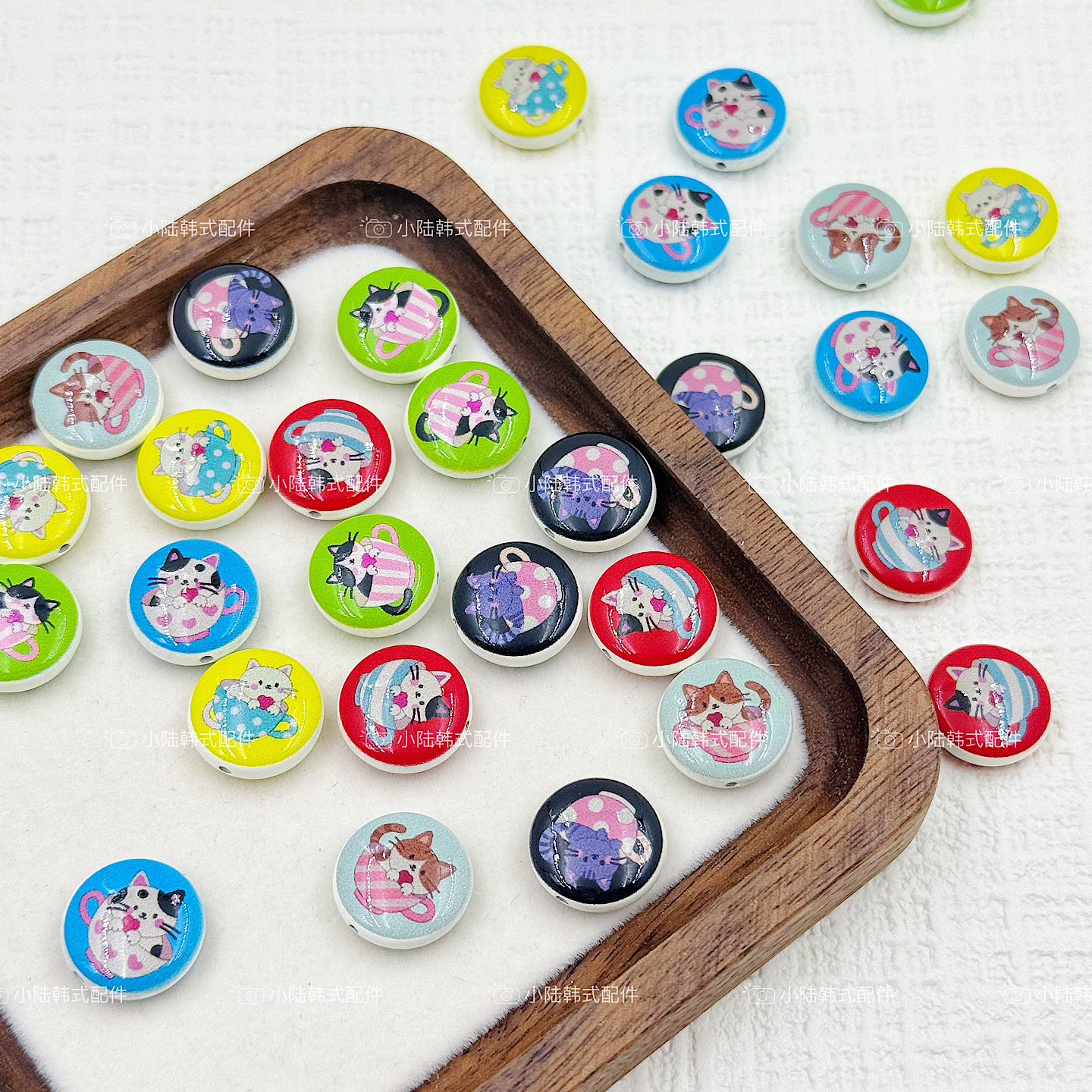 15mm圆形印刷茶杯小猫烤漆合金串散珠手机链项链吊坠发夹饰品配件
