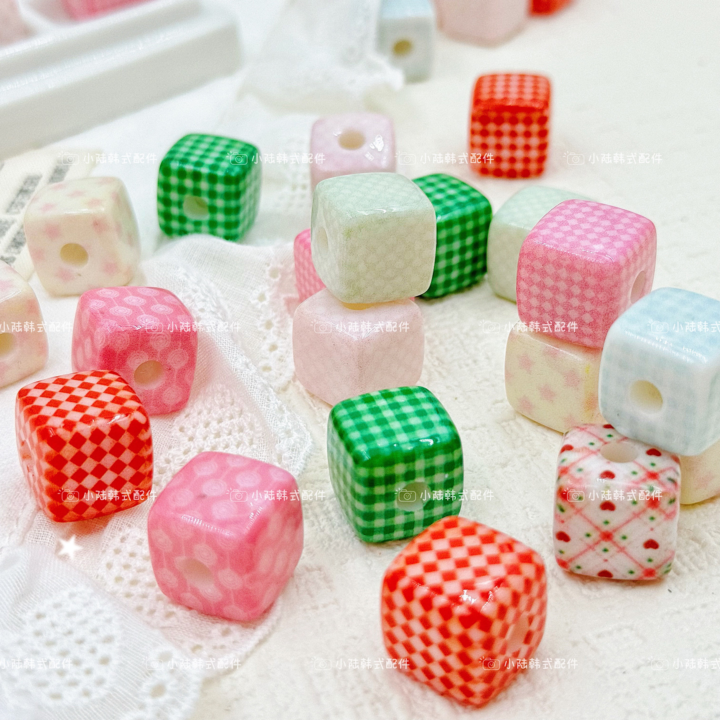 彩色亚克力印刷格子立方体珠子手工diy串珠散珠手机链项链发饰品