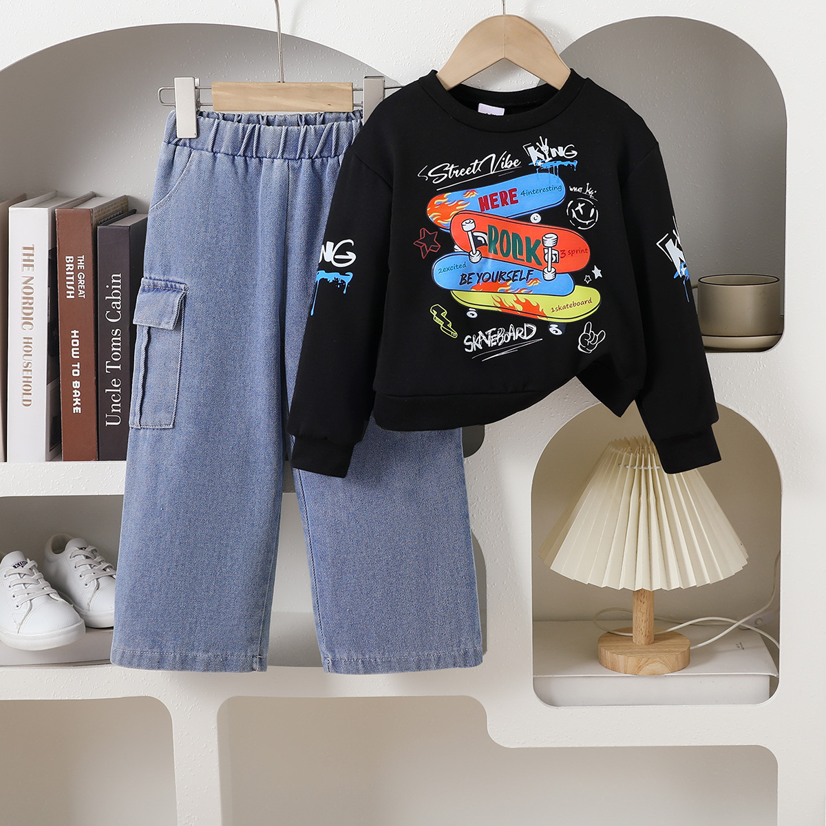 跨境男童潮牌套装 涂鸦字母卫衣+浅蓝工装牛仔裤潮酷宝宝两件套