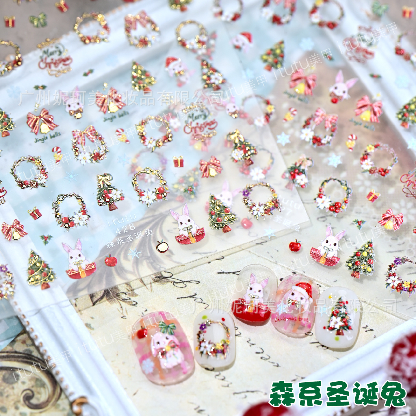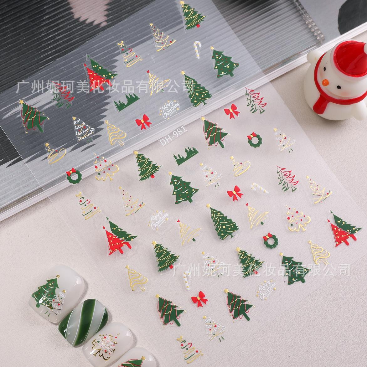 新款美甲贴纸2025圣诞节款式高级烫金圣诞树蝴蝶结背胶指甲装饰贴