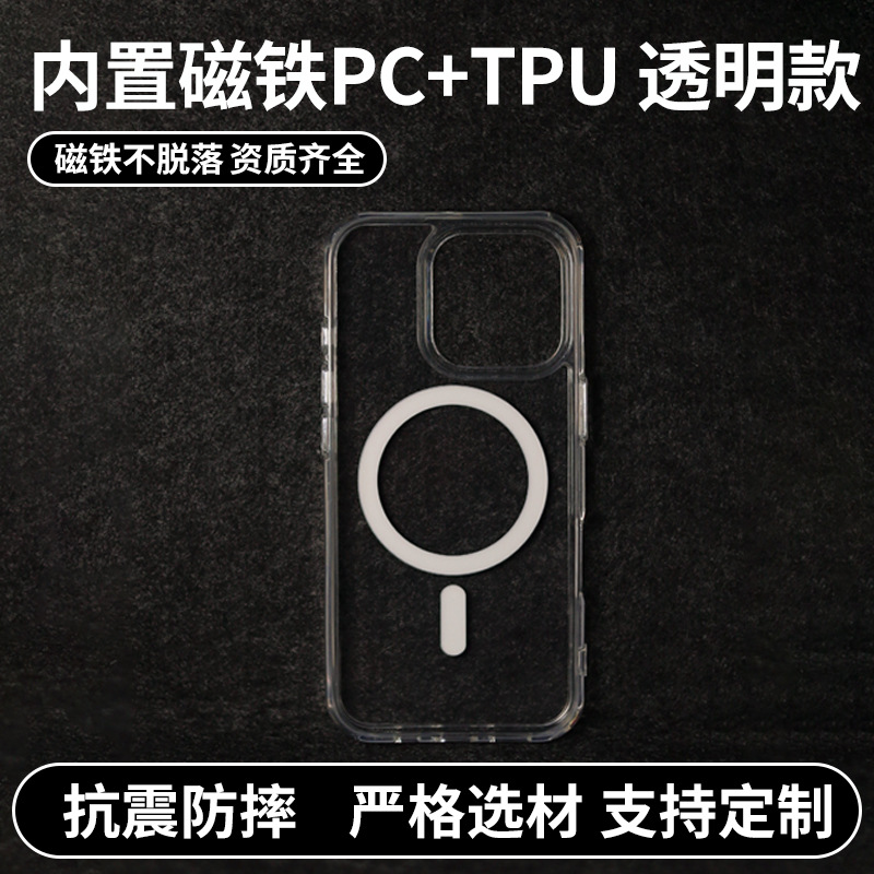 适用苹果手机壳内置磁铁透明款磁吸四角防摔二合一pc+tpu套保护壳