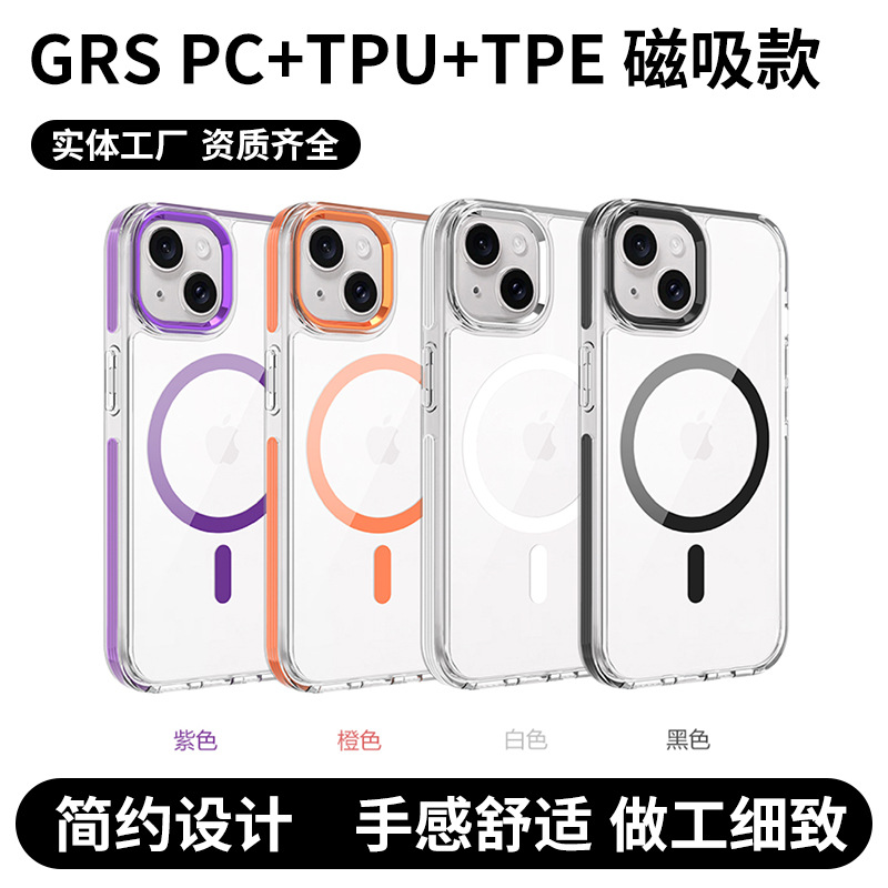 适用iPhone15透明磁吸防撞边框三合一GRS PC+TPU+TPE磁吸款手机套