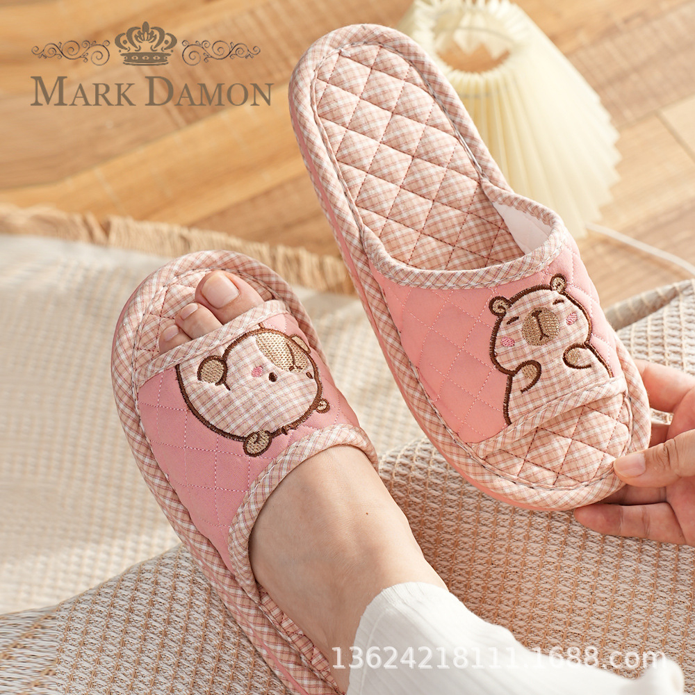新款纯棉布艺可爱卡通情侣拖鞋亲子春秋室内居家加厚防滑静音地板