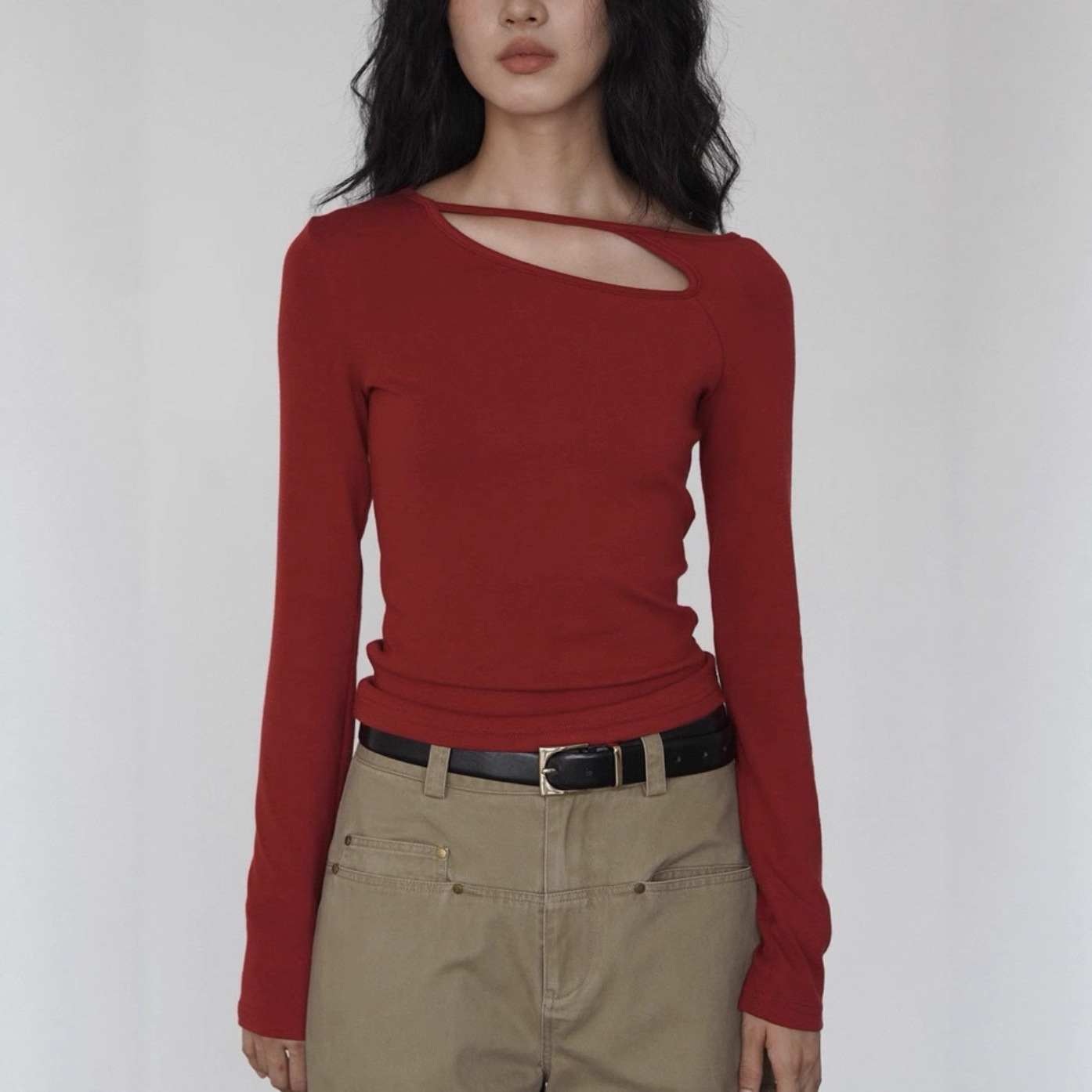 EIGHTHMONTH 红色单侧挖空长袖上衣女设计感小众春季显瘦打底T恤