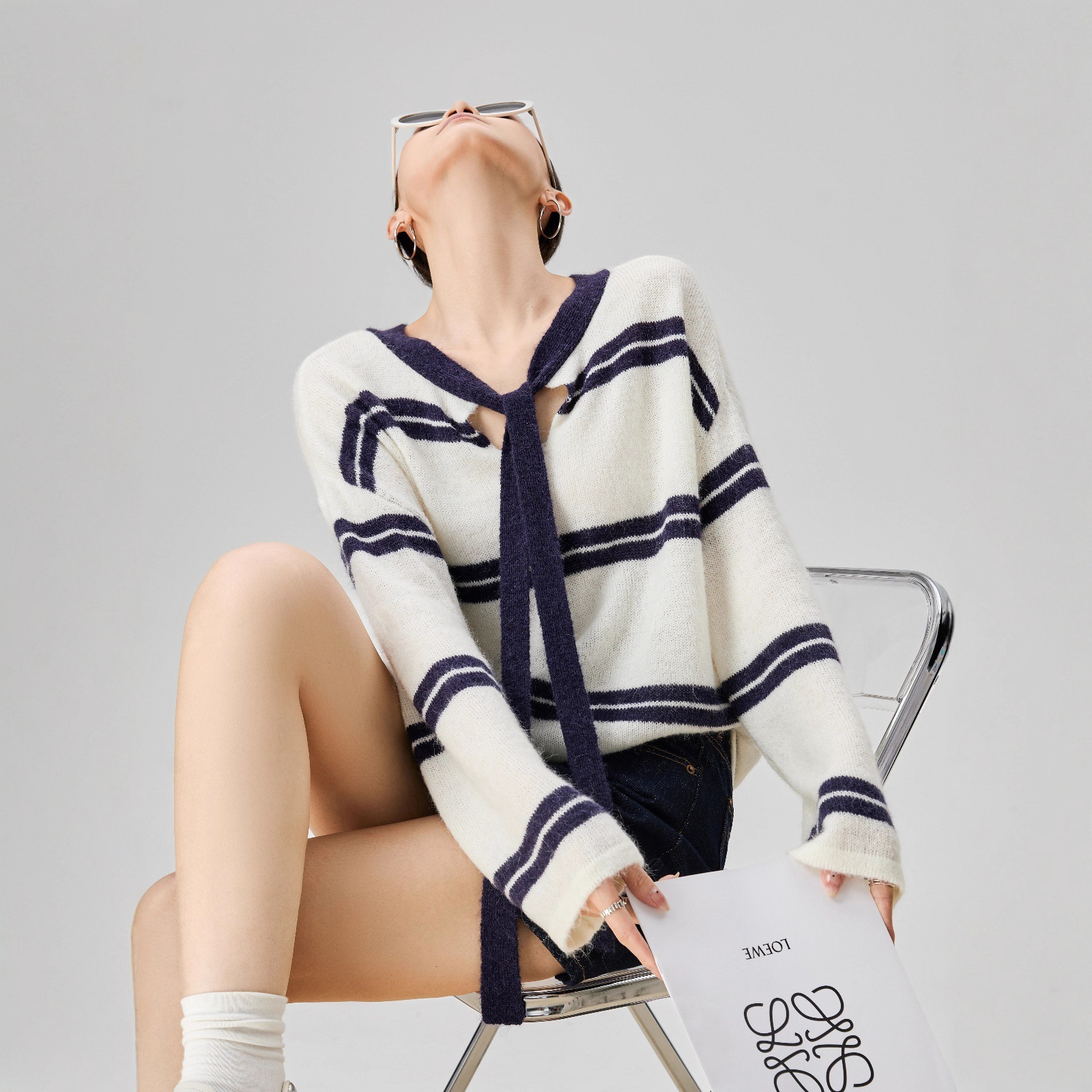 前后两穿马海毛撞色条纹系带长袖针织衫上衣女韩系早秋季穿搭小众