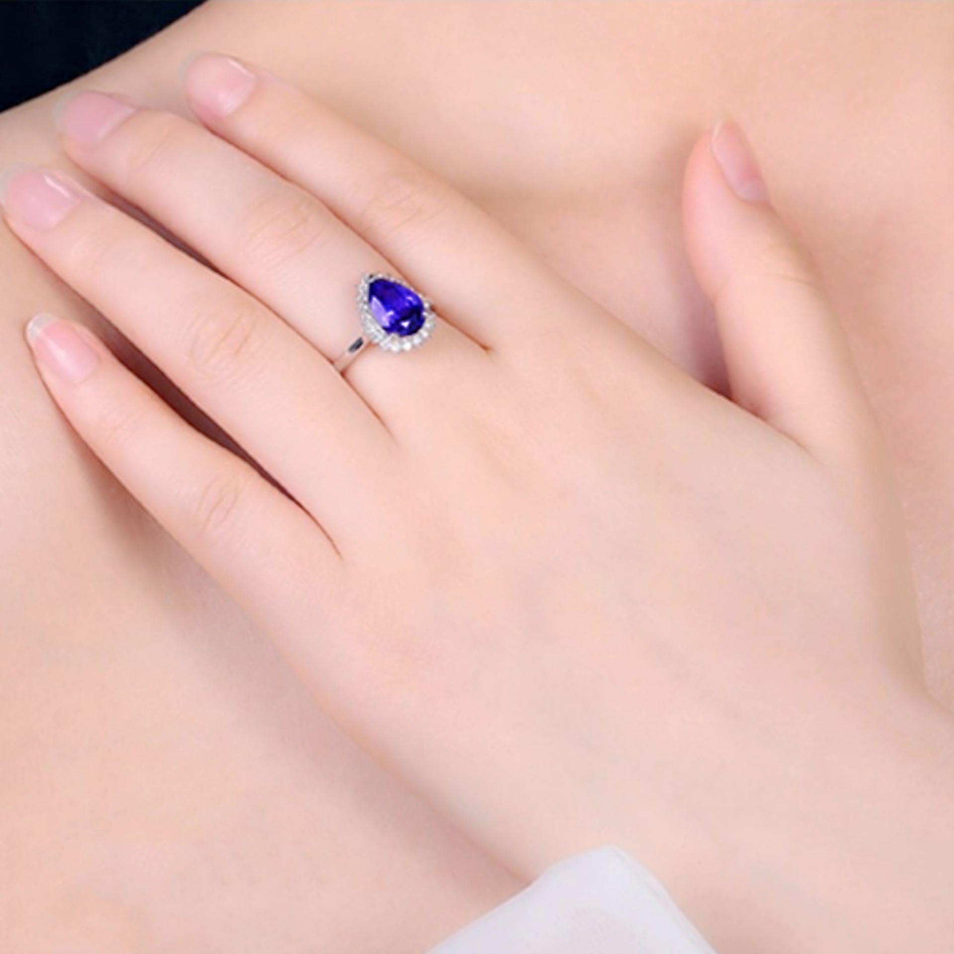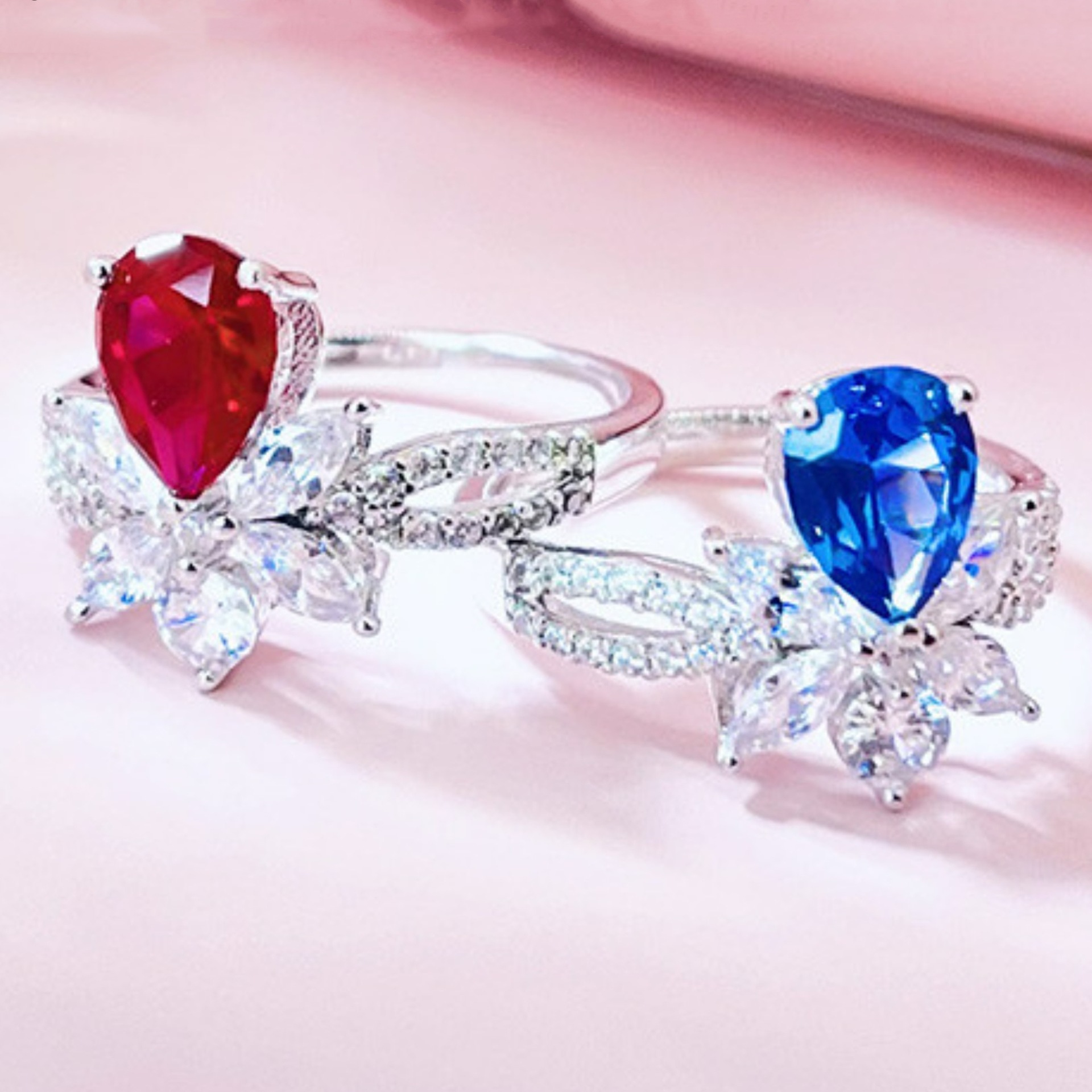 凯恒热卖梨形钻蓝绿红宝石戒指 贵妃款时尚镶水滴钻彩色宝石戒指