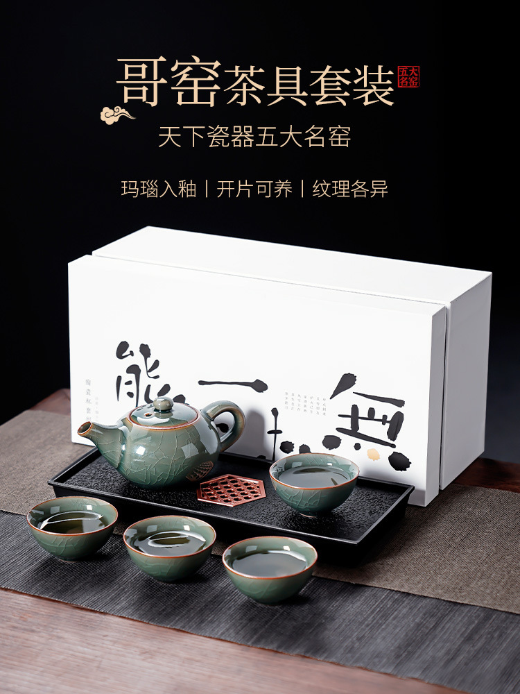 汝窑功夫茶具套装家用办公室轻奢中式泡茶壶茶杯送长辈礼盒陶