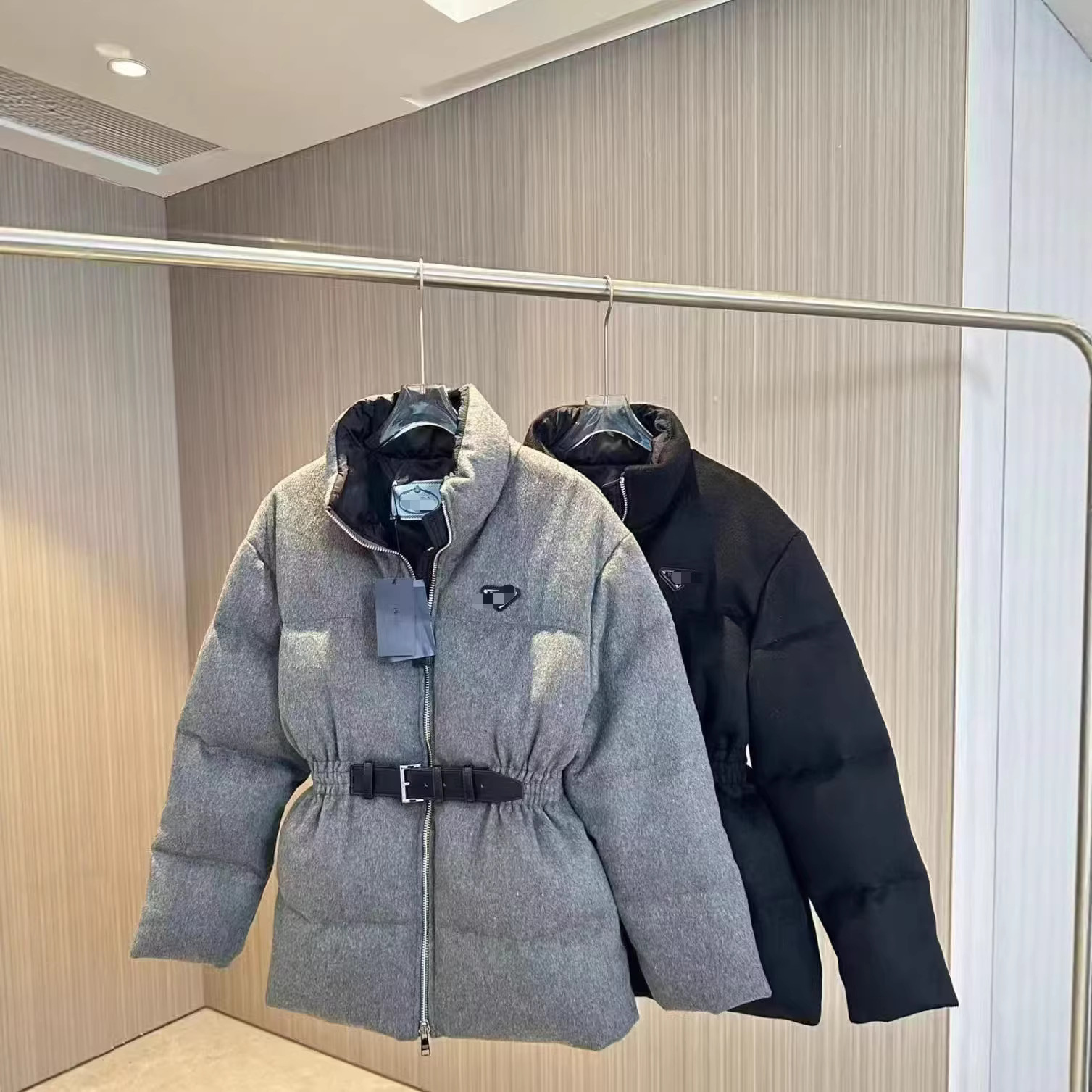 跨境严选高版本pd家女式立领羊毛面料长袖腰带外贸款加厚保暖羽绒