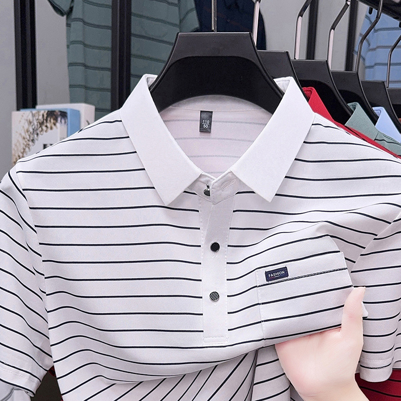夏季男式短袖翻领POLO衫商务男装上衣真口袋条纹T恤衫男 现货代发