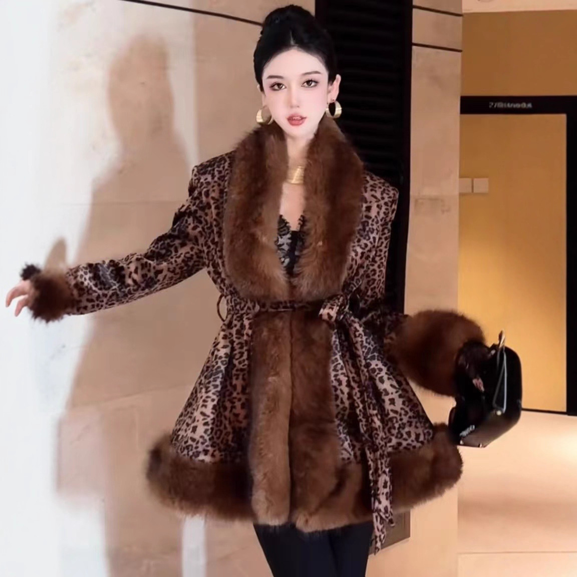 秋冬新款豹纹仿皮草大毛领皮毛一体中长款仿水貂毛绒皮草大衣外套