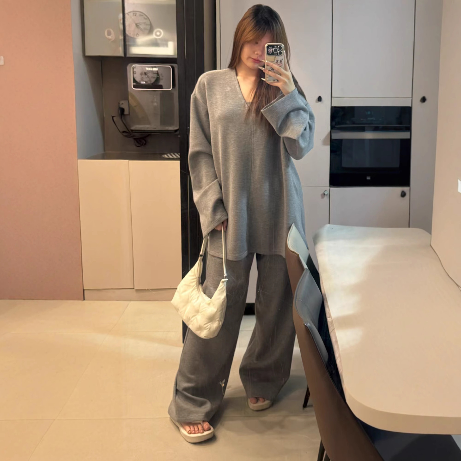 2025新款早秋韩系穿搭慵懒老钱风V领卫衣+阔腿裤两件套女时尚松弛