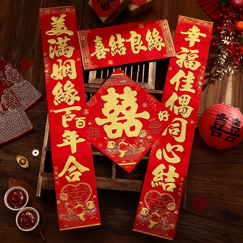 新款绒布鸳鸯结婚门联男方宅门女方出嫁婚庆布置喜庆大门装饰联