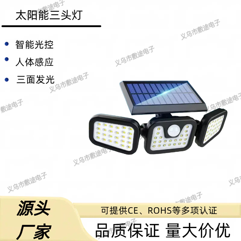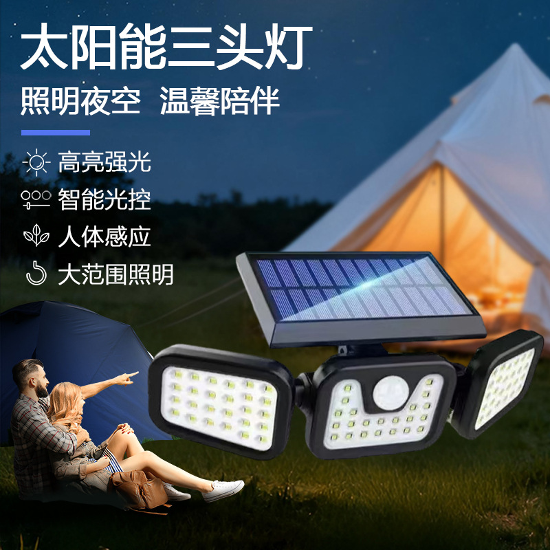 跨境太阳能三头灯人体感应壁灯户外防水庭院路灯可旋转广角照明灯