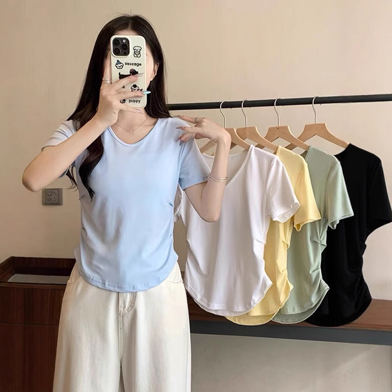 2025新款爆品夏季韩版v领简约糖果色褶皱设计感百搭短袖T恤上衣
