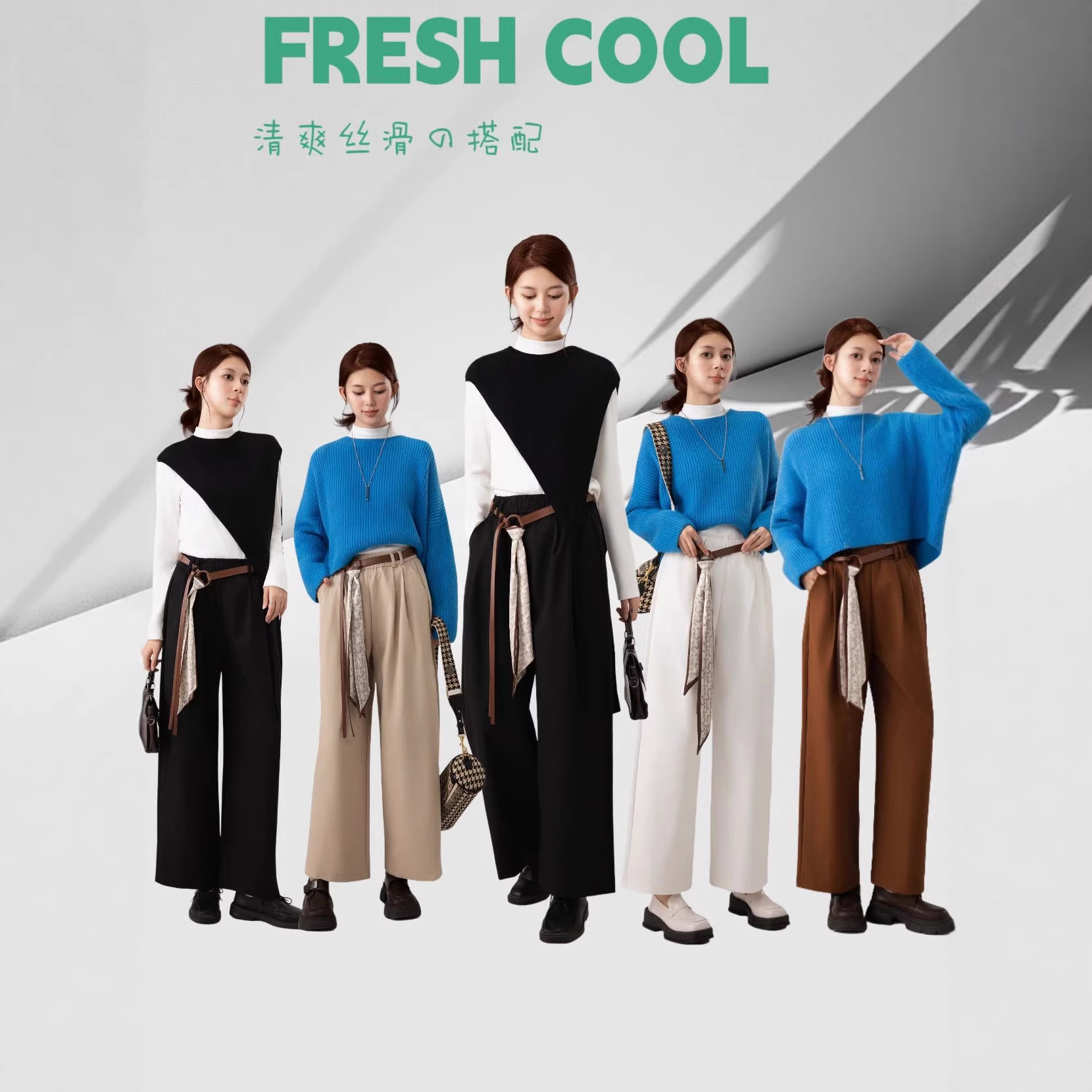 丝巾+飘带钛金棉西装阔腿裤女夏季高腰垂感宽松慵懒风休闲直筒裤
