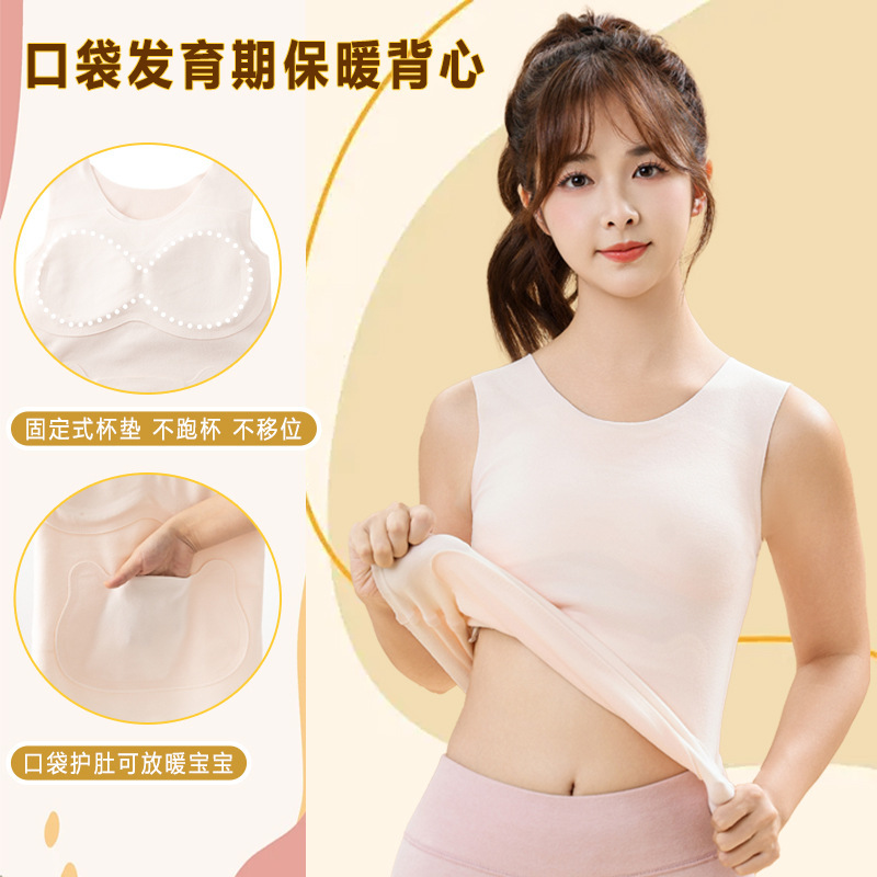 秋冬季少女发育期保暖背心德绒加热无痕上衣带胸垫打底加绒保暖衣
