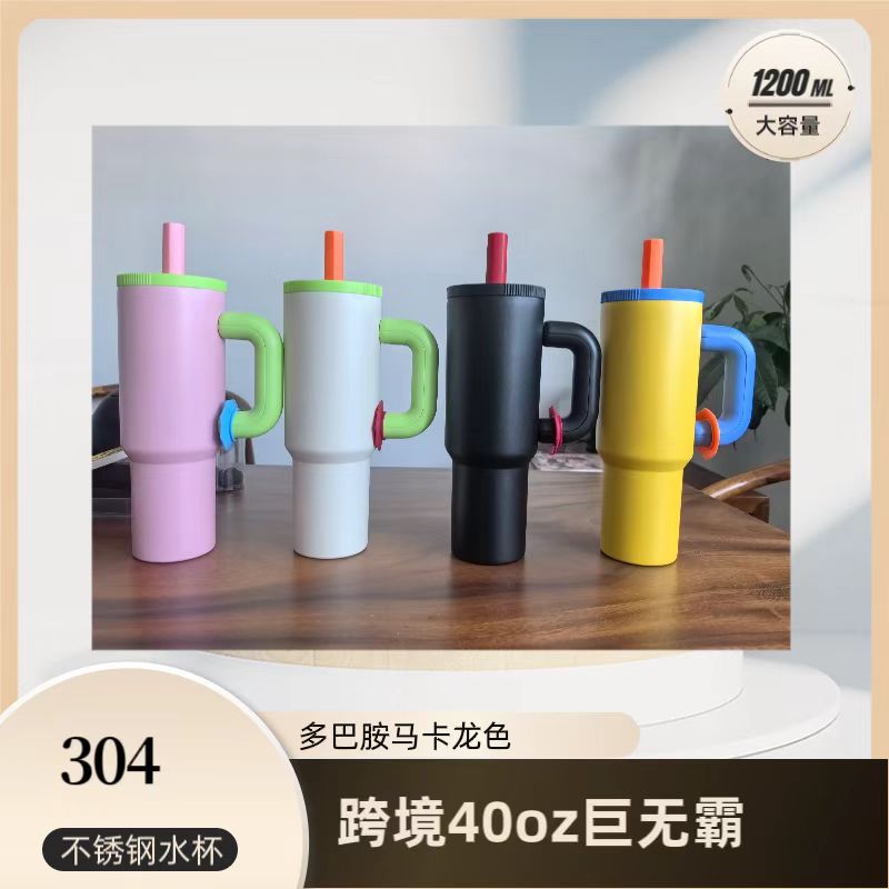 跨境马卡龙304不锈钢手柄汽车杯吸管保温杯户外便携冰霸杯吸管杯
