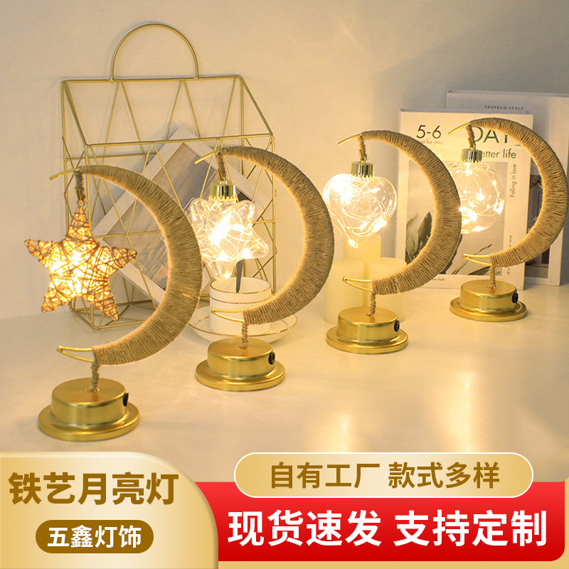 跨境新款LED插电麻绳星星灯铁艺月亮灯圆球发光USB装饰礼物小夜灯