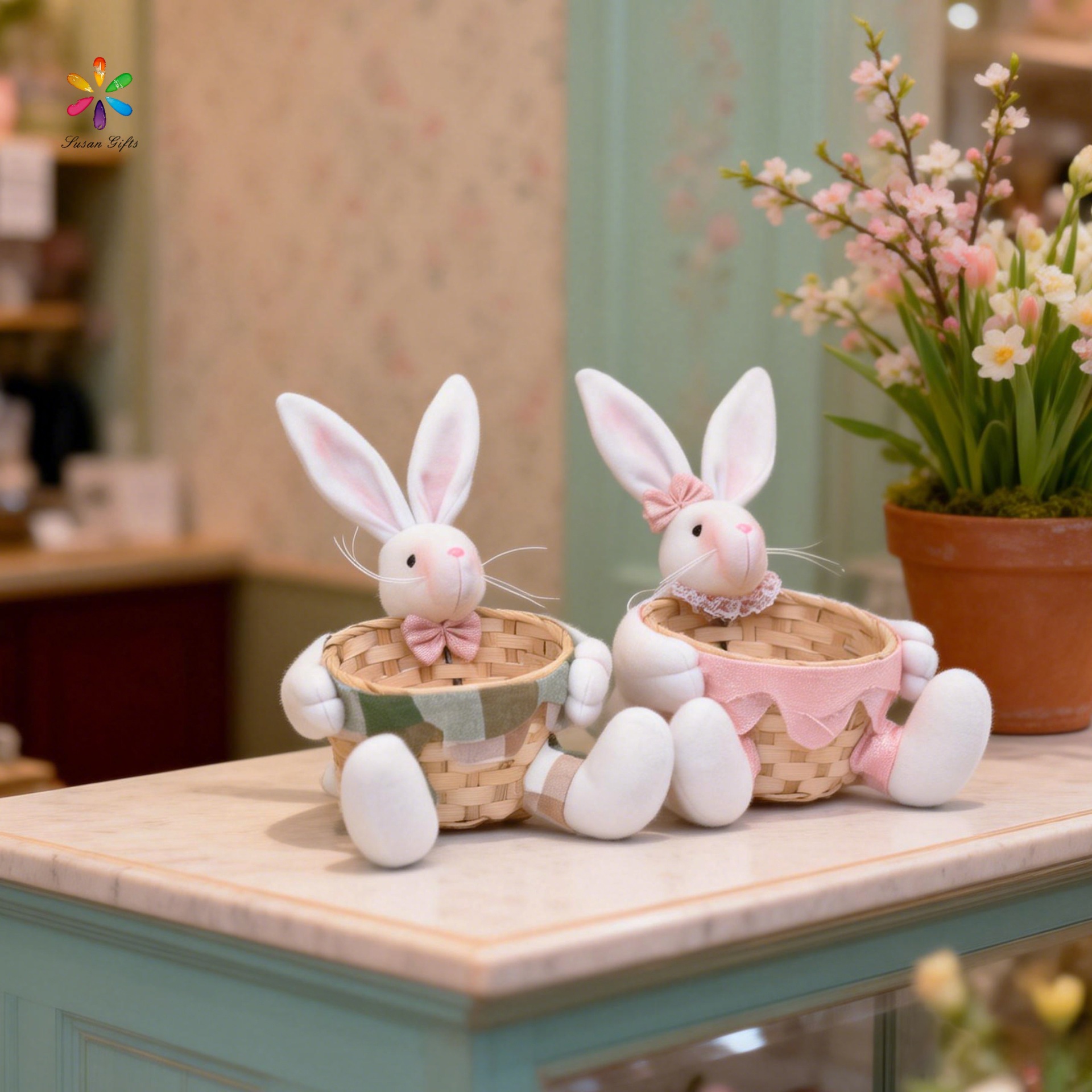 卡通可爱白色粉蝴蝶结兔子复活节家居摆件抱着竹篮复活节彩蛋挂件