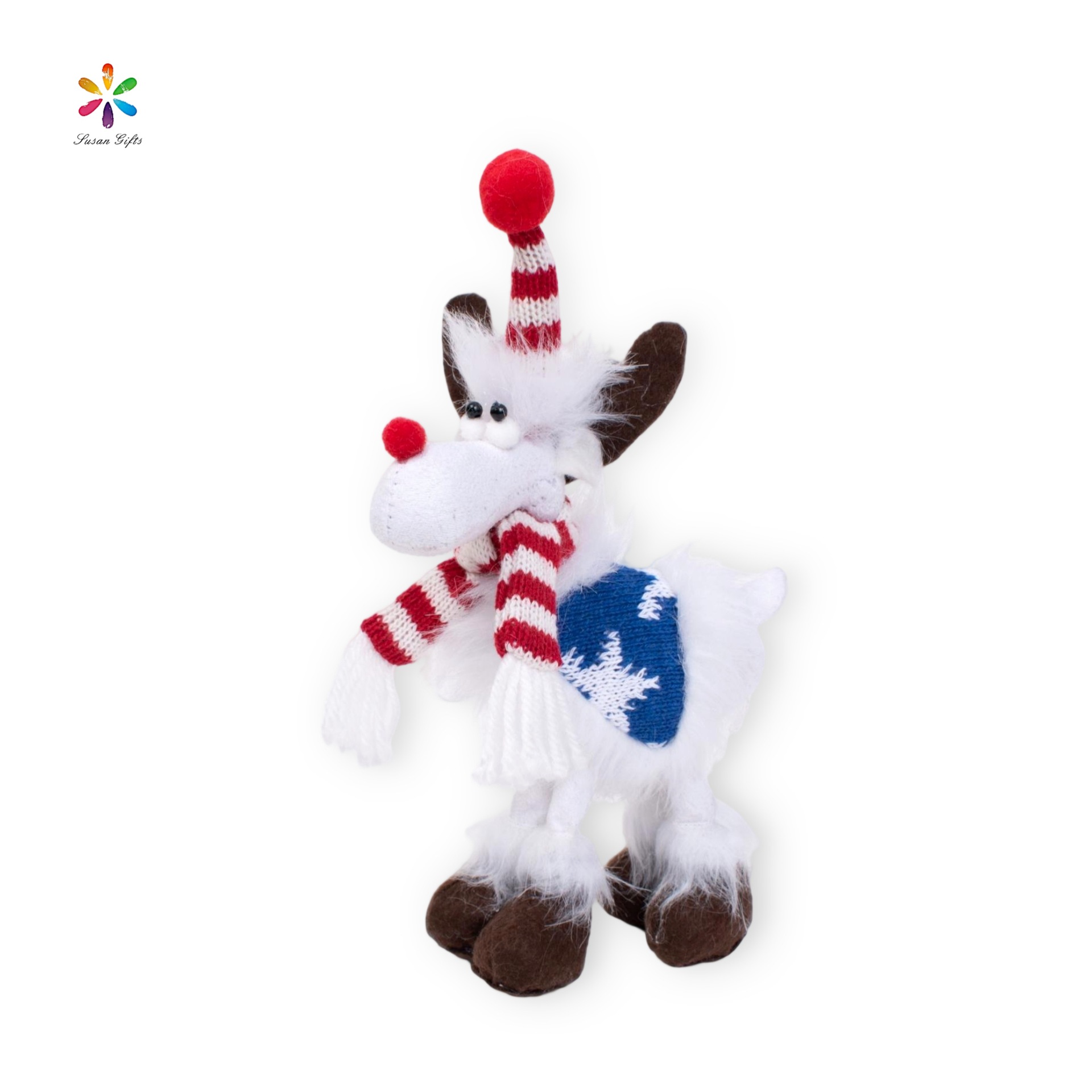 圣诞装饰毛绒四脚着地围巾尖帽鹿四脚站立红白条纹尖帽围巾蓝白鞍