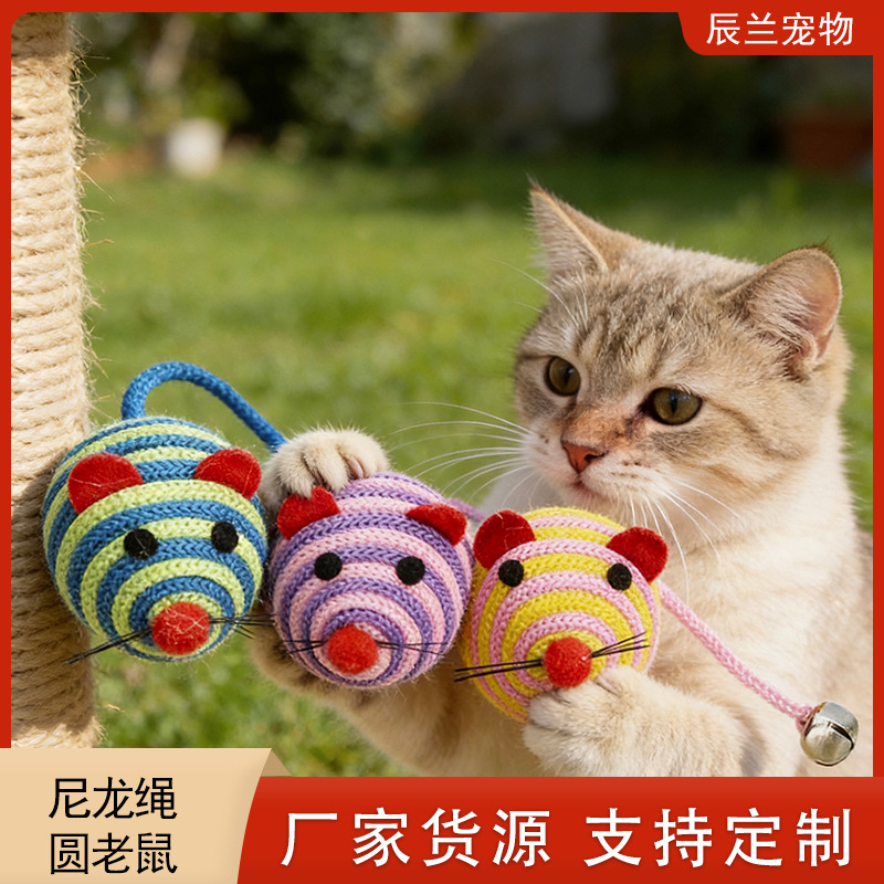 猫玩具铃铛发声互动自嗨逗猫玩具小老鼠跨境宠物玩具尼龙绳圆老鼠