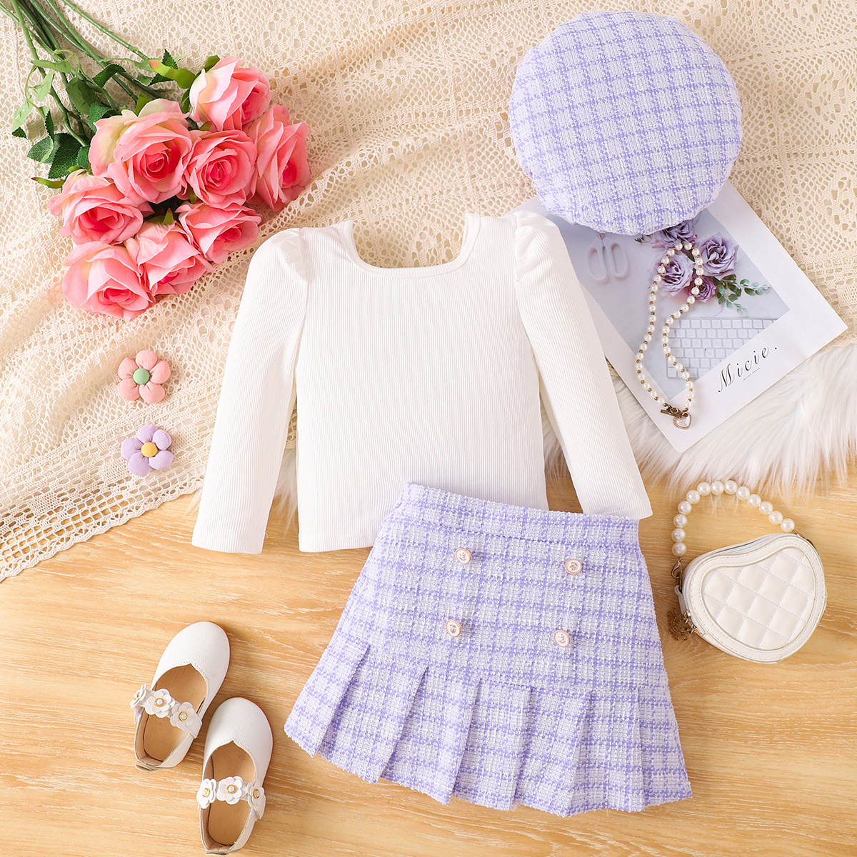女童小香风三件套 白色打底衫+紫色格纹西装+百褶裙