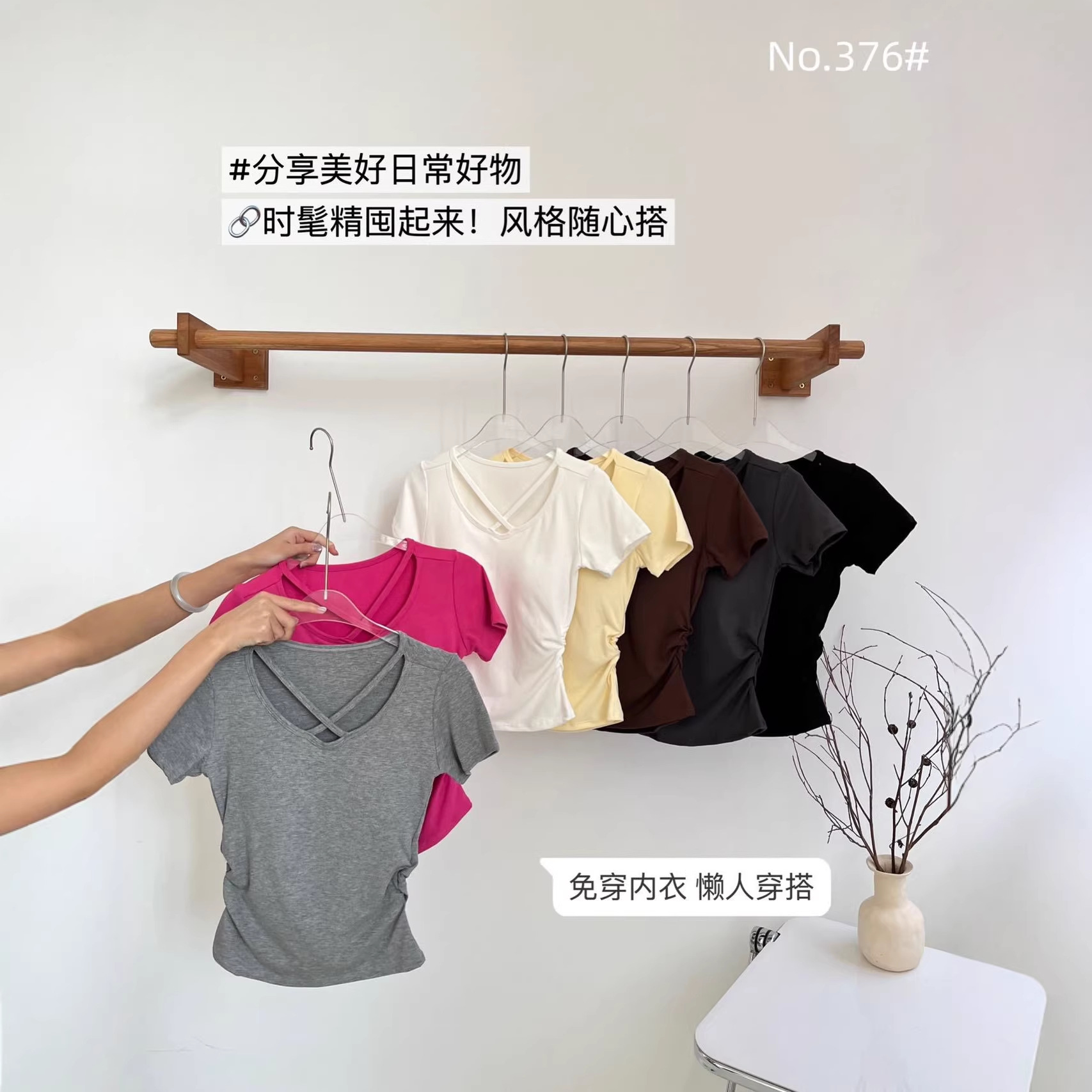 春夏2026新款精梳棉辣妹交叉短袖T恤女设计感修身显瘦带胸垫上衣