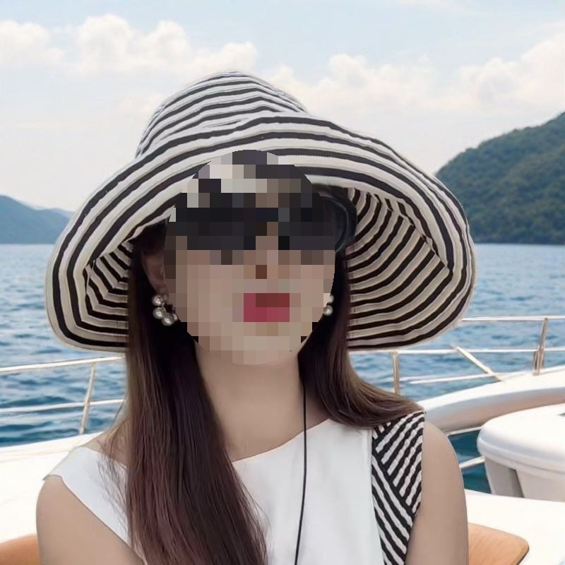 新款帽子遮阳帽防晒防紫外线女复古气质黑白条纹大帽檐太阳渔夫帽