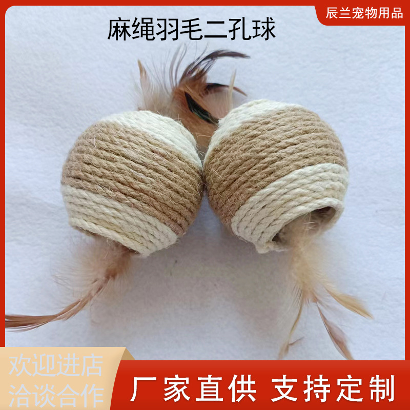 定制猫咪玩具麻绳羽毛两孔球猫玩具球编织跨境麻绳二孔球猫猫玩具