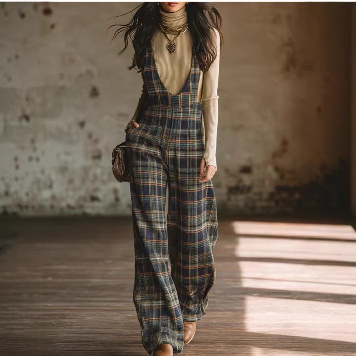 2025秋季欧美跨境亚马逊速卖通女士经典复古格纹工装连体裤