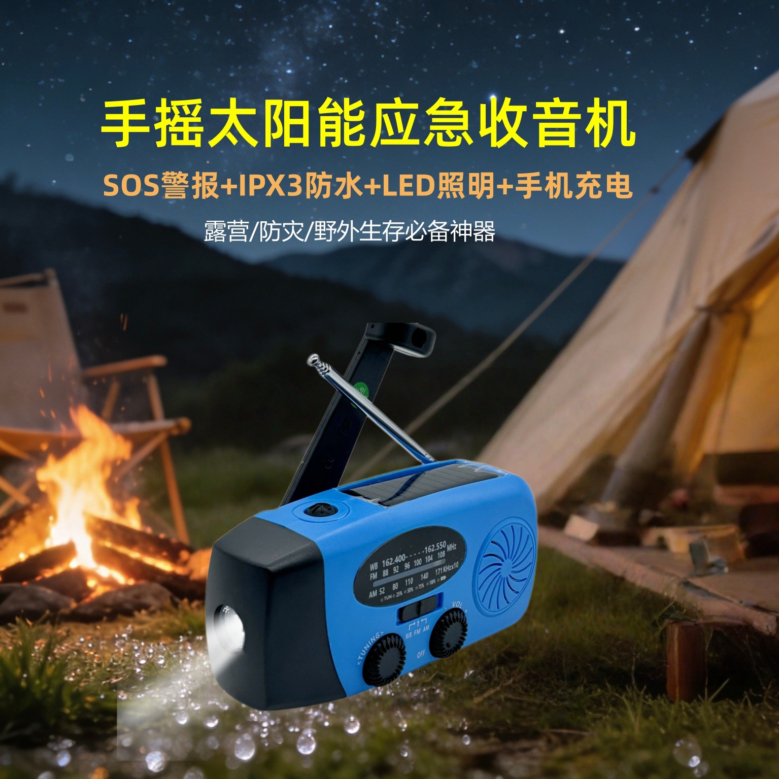 多功能应急收音机手摇太阳能SOS警报IPX3防水户外充电宝