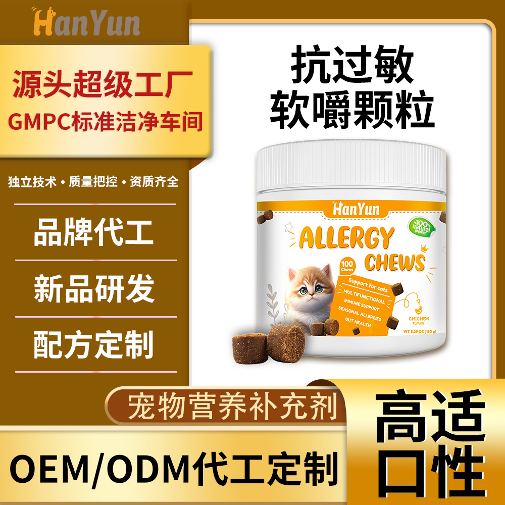 跨境热款猫猫抗过敏软嚼颗粒缓解季节性过敏营养补充剂咀嚼片代工